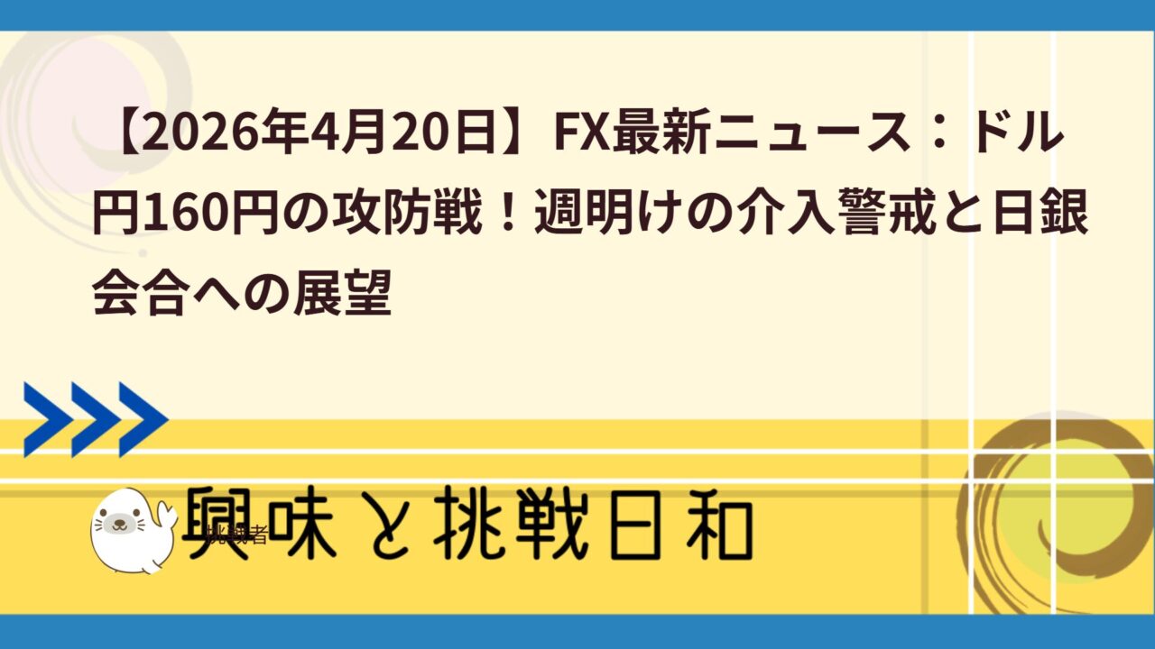 2026年4月20日(月曜日)、週明けの東京為替市場は、先週末の流れを引き継ぎ1ドル=159円台後半という、極めて緊迫した水準で取引が再開されました。市場の関心は「いつ160円を突破するのか」、そして「政府・日銀の実弾介入はいつ行われるのか」という1点に集中しています。