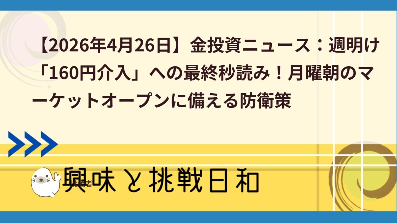 2026年4月26日(日曜日)、為替市場や金市場は休場中ですが、投資家の間では「明日、4月27日(月曜日)の朝一に何が起きるか」という議論が活発に行われています。先週末、ドル円がついに160円の大台を突破したことで、日本の金価格は歴史的な高値圏にあります。