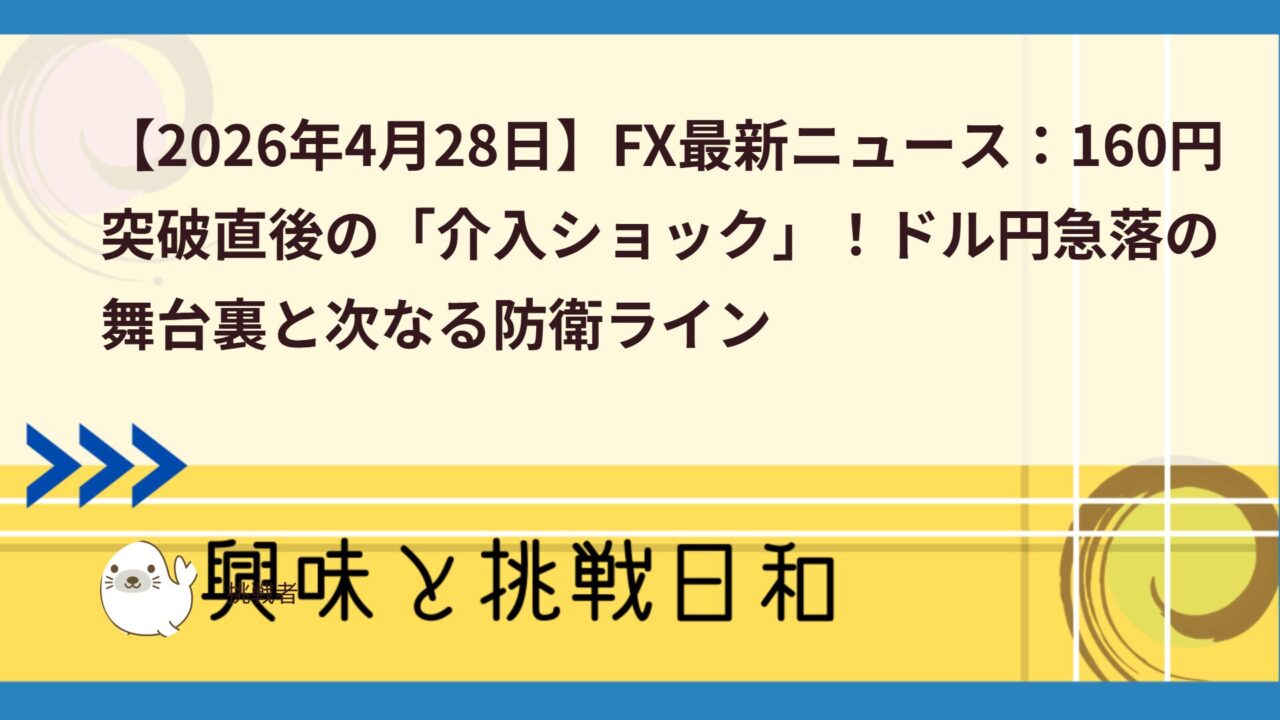 【2026年4月28日】FX最新ニュース:160円突破直後の「介入ショック」!ドル円急落の舞台裏と次なる防衛ライン